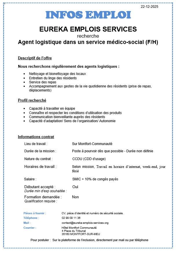 Agent Logistique dans un service médico-social (F/H) par Eureka Emplois Services | 7 Jan 2026 | offre emplois | 0 commentaires