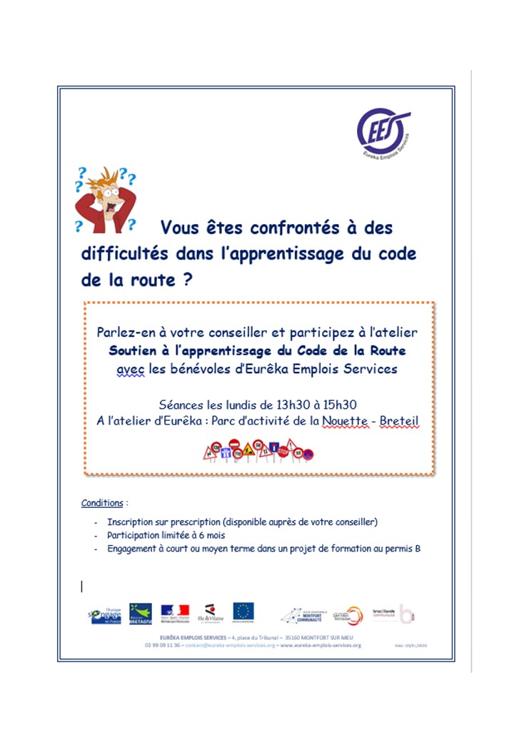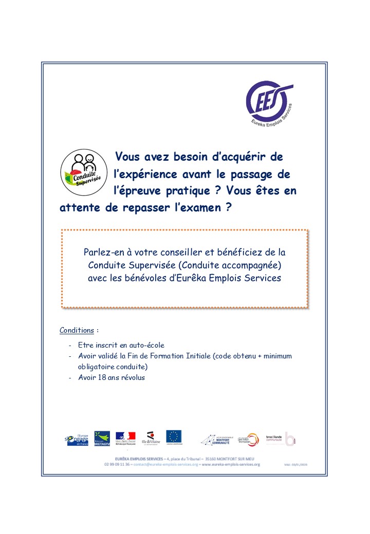 Vous avez obtenu votre code de la route mais vous ne parvenez pas à passer la conduite ? Si votre auto-école vous y autorise, vous pourrez effectuer des cours de conduite supervisée avec l’un de nos 4 bénévoles. Pour pouvoir y prétendre, il faut résider sur le Pays de Brocéliande et être prescrit par We Ker ou par le Centre Départemental d’Action Sociale. Cette action est réalisée grâce au soutien du Conseil Départemental. Consultez l’affiche https://www.eureka-emplois-services.org/conduite-supervisee/