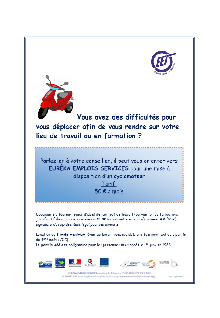 Depuis 2009, notre association gère un Parc cyclomoteurs destiné à apporter une réponse aux problèmes de mobilité des demandeurs d’emploi du Pays de Brocéliande. Si vous rencontrez un problème pour accéder à l’emploi ou pour vous rendre à votre travail, vous pouvez bénéficier d’un de nos 50 cyclomoteurs sur prescription d’un partenaire (Point Accueil Emploi, We Ker, Centre Départemental d’Action Sociale, Agence d’Intérim, etc…). Consultez l’affiche https://www.eureka-emplois-services.org/location-scooters-tarifs-2023/ Des bénévoles de notre association dispensent des cours de soutien au code de la route, en lien avec les auto-écoles du territoire, aux personnes ayant besoin d’une aide dans l’acquisition des bases du code. Les cours ont lieu toutes les semaines à Montfort sur Meu. Consultez l’affiche https://www.eureka-emplois-services.org/la-mobilite/atelier-code-maj-janvier-2023-2/